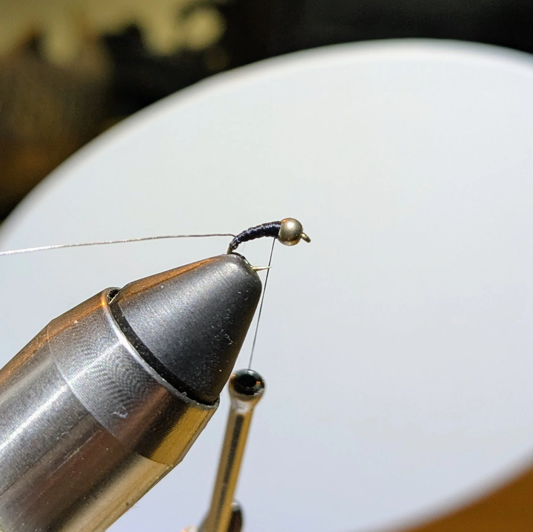 Using your thread, build up a slender, tapered body toward the bead or hook eye. Keep the body smooth and even—this is key to the fly’s natural look.