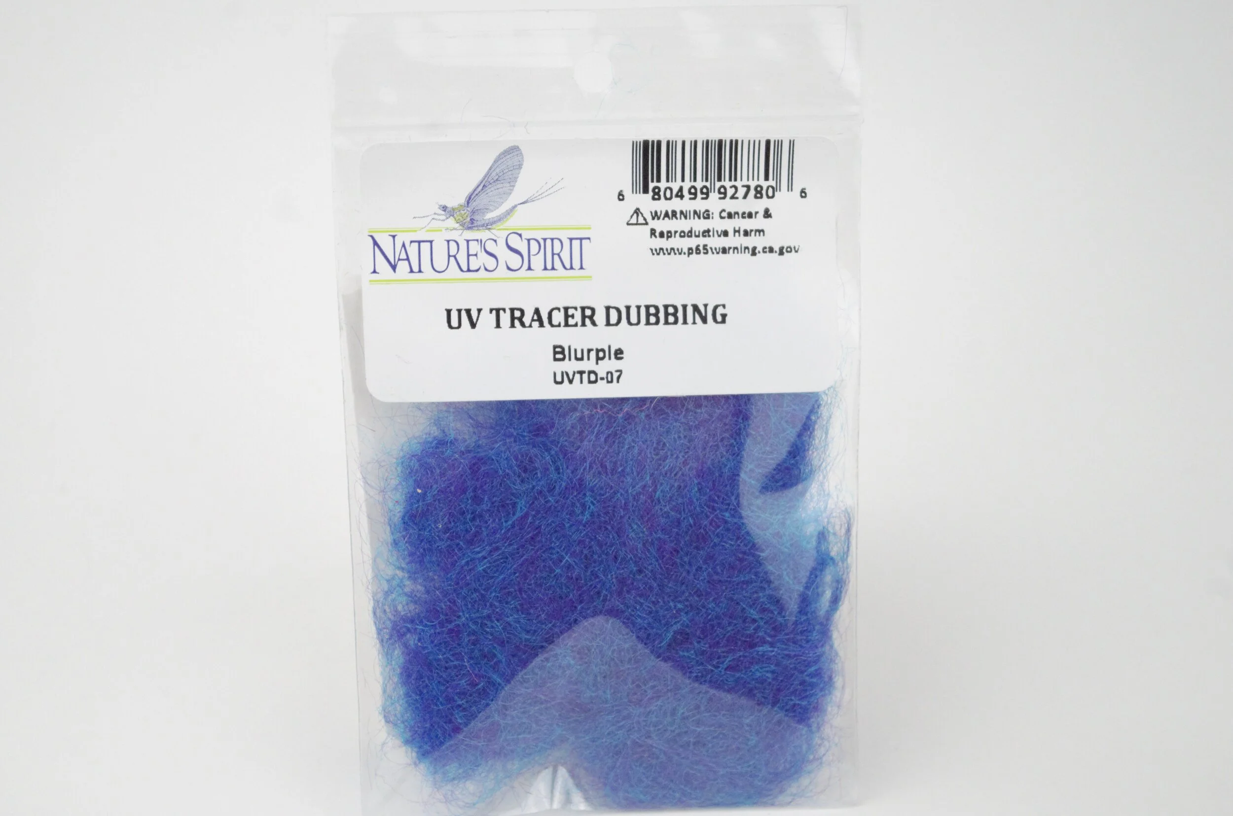 UV Tracer dubbing is a blend of synthetic fibers treated with UV dye. These blends are a mix of UV dyed and Non-UV dyed fibers, with at least 50% of the dubbing being UV treated. This gives the fibers an amazing tracing effect through the dubbing resulting in a mid length dubbing perfect for trout and steelhead flies.